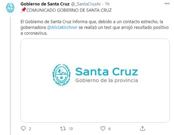 La información fue confirmada por el gobierno provincial a través de las redes sociales. “Debido a un contacto estrecho, la gobernadora Alicia Kirchner se realizó un test que arrojó resultado positivo a coronavirus”, detallaron en un comunicado oficial.