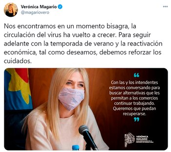 Por su parte, la vicegobernadora bonaerense, Verónica Magario, señaló en su cuenta oficial de la red social Twitter que “a fin de continuar con la temporada turística, establecimos nuevos parámetros de riesgo sanitario para que cada localidad responda a sus necesidades”. ”Mantengamos los cuidados y evitemos los eventos masivos para que todas y todos puedan disfrutar sus vacaciones en la Provincia”, remarcó.