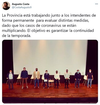 Uno de los que participó de ese encuentro fue el ministro de Producción bonaerense, Augusto Costa, quien también sostuvo: “El objetivo principal es garantizar la temporada turística”. ”Lo principal es cuidar la salud, cuidar la temporada, el trabajo y la producción”, puntualizó Costa, quien planteó que habrá “una ronda de consultas con intendentes para tomar las medidas más adecuadas para este momento de la situación sanitaria, para que se pueda garantizar la continuidad de la temporada turística y se pueda revertir esta tendencia preocupante”.
