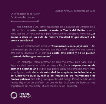“Nos dirigimos a Ud. como estudiantes de la Facultad de Derecho de la UBA -en la cual usted enseña la materia Teoría del Delito- y como militantes de la Franja Morada, para formularle una pregunta concreta: ¿Se anima a decir en un aula de nuestra Facultad lo que declaró a la prensa en México?”, comienza el mensaje.