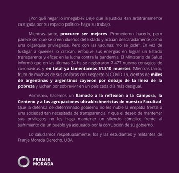 En el texto también se crítica cómo el gobierno nacional gestionó la administración de las vacunas y se detalla la cantidad de contagios y muertes por coronavirus en el país. “¿Por qué negar lo innegable? Deje que la Justicia -tan arbitrariamente castigada por su espacio político- haga su trabajo”, concluyeron los estudiantes.