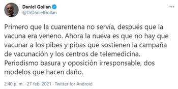 En la misma línea, el ministro de Salud bonaerense, Daniel Gollán, también criticó a la oposición y a un sector del periodismo. “Primero que la cuarentena no servía, después que la vacuna era veneno. Ahora la nueva es que no hay que vacunar a los pibes y pibas que sostienen la campaña de vacunación y los centros de telemedicina. Periodismo basura y oposición irresponsable, dos modelos que hacen daño”, publicó en las redes sociales.
