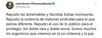 En tanto, el presidente de la Coalición Cívica ARI sentenció: “Repudio las lamentables y fascistas bolsas mortuorias. Repudio la violencia de matones sindicales para el que piensa diferente. Repudio el uso de lo público para el privilegio. Sin doble vara y doble moral. Somos muchos los argentinos que creemos en la no violencia y la paz”.