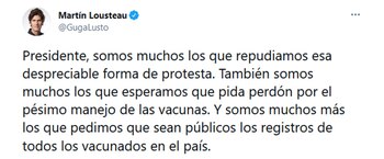 “Presidente, somos muchos los que repudiamos esa despreciable forma de protesta. También somos muchos los que esperamos que pida perdón por el pésimo manejo de las vacunas. Y somos muchos más los que pedimos que sean públicos los registros de todos los vacunados en el país”, aseguró Lousteau a través de su cuenta de Twitter.