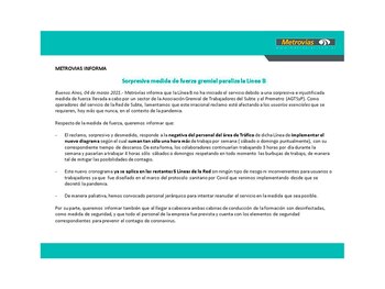 Pasadas las 10 de la noche emitieron un comunicado en el que anunciaron: “Hemos decidido paralizar el servicio desde las 0 hs de este jueves para proteger nuestra salud”. En ese sentido apuntaron contra la “actitud criminal” de la empresa Metrovías “que desde el inicio de la pandemia viene exponiendo a los trabajadores y usuarios a condiciones que ponen en riesgo la salud y la vida frente al COVID-19″.