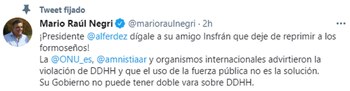 A su vez, el presidente del interbloque Juntos por el Cambio en Diputados, Mario Negri, le reclamó a Alberto Fernández que le diga “a su amigo Insfrán” que deje de reprimir a los formoseños. “Su gobierno no puede tener doble vara sobre los derechos humanos”, dijo.