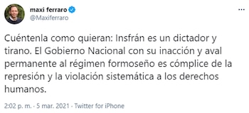 “Cuéntenla como quieran: Insfrán es un dictador y tirano”, afirmó, por su parte, el presidente de la Coalición Cívica, Maximiliano Ferraro, quien también argumentó que el gobierno nacional “con su inacción y aval permanente al régimen formoseño es cómplice de la represión y la violación sistemática a los derechos humanos”.