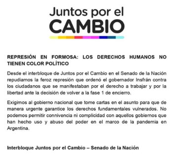 A través de un comunicado difundido en las redes sociales, el interbloque de senadores de Juntos por el Cambio exigió que el gobierno nacional tome cartas en el asunto para garantizar de manera urgente “los derechos fundamentales vulnerados”.