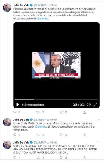 “El mérito de Martín Soria para ser ministro de Justicia sería que es anti kirchnerista, según @alferdez”, continuó el ex funcionario quien agregó: “El silencio compañeros se transformará en complicidad”.