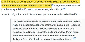 La manipulación de la hora exacta de su muerte habría sido obra de Alejandro Apold. Si bien Evita habría fallecido unos minutos antes, las “20 y 25” eran números más precisos para recordar, más a fuerza de repetición en los medios de comunicación, como sucedería.