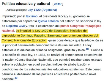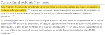 15. “Julio Argentino Roca ha sido considerado como uno de los funcionarios públicos que más se enriquecieron durante la función pública”. La fuente que cita Wikipedia es una frase de Domingo F. Sarmiento de diciembre de 1885: esa frase es la única fuente. La pronunció Sarmiento en el momento en que era un duro opositor a Roca y al mismo tiempo que era sancionada la Ley 1.420 de Educación Laica, Gratuita y Obligatoria. Ello de por sí demuestra que Sarmiento no jugó un rol en la elaboración y sanción de este proyecto dada la situación política.