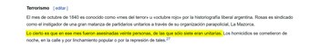 La nota de Wikipedia le baja el precio al terror del año 40 diciendo que solo hubo veinte víctimas y de ellas solo 7 unitarios. Sin explicar correctamente el accionar de la mazorca y el terror desde el centro del Estado.