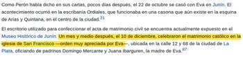 Sin embargo, el sitio no aclara que ese fue el segundo intento. Originariamente, la pareja había fijado como día del enlace el jueves 29 de noviembre. Perón quiso mantenerlo en secreto, pero el dato se filtró y cuando el auto que llevaba a la pareja se aproximaba al lugar, vieron a una multitud que los esperaban y siguieron de largo. “Yo así no me caso”, dijo él. Finalmente, lo hicieron ese 10 de diciembre a las 20:25 horas, siendo padrinos Domingo Mercante, amigo del novio y Juana Ibarguren, mamá de la novia.