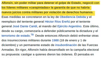 Alfonsín, sin poder militar para detener el golpe de Estado, negoció con los líderes militares «carapintadas» la garantía de que no habría nuevos juicios contra militares por violación de derechos humanos. No se negoció con los carapintadas. La ley de Punto final es anterior al alzamiento.