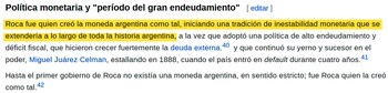 5. En “Política monetaria y periodo de gran endeudamiento” se dice que “Roca fue quien creó la moneda argentina como tal, iniciando la tradición de inestabilidad monetaria que se extendería a lo largo de toda la historia argentina, a la vez que adoptó una política de auto endeudamiento y déficit fiscal”. Esta afirmación es discutible.
