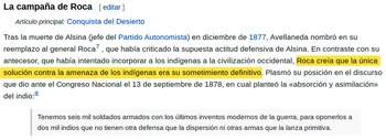 3. Los números y cantidades respecto a la faz militar de la llamada “Conquista del Desierto” deben partir de una referencia que Wikipedia omite en todo el texto sobre Roca: al momento de la Campaña de Roca al Río Negro, la población del país era de algo más de 1.800.000 habitantes (Censo de Sarmiento de 1869). Los números sobre indios muertos y prisioneros hay que proyectarlos sobre la población total para significarlos. Se cita la Campaña de Río Negro, en la cual, como dice la Memoria del Ministerio de Guerra presentada por Roca, murieron 1.303 indios de lanza (de pelea) y 1.271 de esta misma categoría fueron hechos prisioneros. De las mujeres, niños y ancianos -que se denominaban la “chusma” en el lenguaje rural- fueron hechos prisioneros 10.539. Cabe señalar que 46 años antes, en la Campaña de Rosas “al Desierto”, fueron muertos 3.600 indios. El informe de Wikipedia vincula también el término “genocidio” a la llamada “Expedición al Desierto”, pero no lo afirma rotundamente. La realidad es que se trató de una acción de sometimiento al Estado, pero no de aniquilamiento.