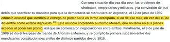 Es sesgado y erróneo cuando se menciona que no habilitó negociaciones colectivas de salarios. Después dice “Alfonsín abandonó la presidencia con su popularidad en descenso debido a los malos resultados económicos de su gestión y las leyes de impunidad que impulsó para impedir el enjuiciamiento de los crímenes de lesa humanidad”. Las leyes de impunidad es una forma coloquial negativa. Correspondería decir leyes de obediencia debida y punto final, aunque no creo que haya afectado la baja de su popularidad. Pareciera decir que fue todo un desastre, pero al final la gente le volvió a tener cariño.