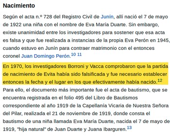 Esa construcción comenzó con la fecha de su nacimiento. Si bien Wikipedia pone de relieve los dos años posibles, 1919 y 1922, no aclara el porqué hay un tironeo entre ellos. Para intentar hallar una interpretación, debemos remitirnos al casamiento de la pareja, cuando es preciso presentar los certificados de nacimiento. Biografías de Eva como la de Alicia Dujovne Ortiz, o la que escribió Joseph Page sobre Perón, que además cita la biografía de Evita escrita por Borroni y Vacca, revelan algunas claves.