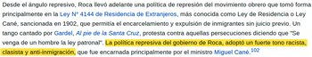 Wikipedia le adjudica un “fuerte tono racista, clasista y antiinmigración” que no responde a la realidad: el flujo migratorio de los seis años de este periodo muestran un claro incremento. En cuanto a la represión de huelgas y otras protestas, es también lo que sucedía en el resto del mundo, como muestra la historia global. El artículo reconoce adecuadamente que por Roca en este periodo se inició la seguridad social, se anticipó la primera legislación laboral y se presentó en el Congreso el primer proyecto de Código Nacional del Trabajo, que no llegó a ser sancionado por la resistencia del Senado.