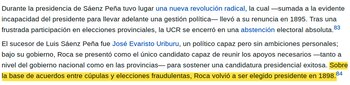 10. Sobre la reelección de Roca en 1898 se afirma que fue en “base a acuerdos entre cúpulas y elecciones fraudulentas”. Sin entrar a polemizar con esta afirmación, cabe señalar que los sistemas electorales de finales del siglo XIX en Occidente, en todos los casos eran de participación restringida o limitada, votando porcentajes muy pequeños de la población, como sucedía también en Argentina. Pero el factor que no se menciona, y que fue decisivo para que Pellegrini renunciara a su candidatura en favor de Roca, era el peligro de guerra con Chile, que parecía inminente, y Roca, por su experiencia militar, era considerado el más apto en esas circunstancias.