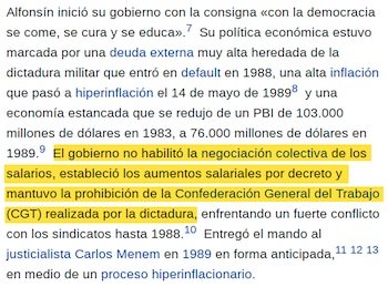 Lo más sesgado de la entrada es la política laboral del gobierno de Alfonsín. A la CGT se le levanta la prohibición a finales del gobierno militar, a través de la Ley 22.839. La CGT recuperó su status legal al permitir el funcionamiento de las asociaciones gremiales de tercer grado, es decir de Confederaciones. Los convenios colectivos de trabajo se reestablecen durante el gobierno de Alfonsín. Da a entender una continuidad entre la política sindical del proceso militar y la del gobierno democrático. No es así. La matriz del asunto era el modelo sindical.