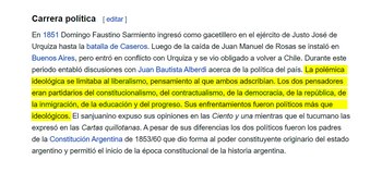 2. Uno de los principales problemas es la cuestión siempre presente del “liberalismo”, una verdadera obsesión del neorreivisionismo que suele estar acompañada, como en este caso, por una profunda ignorancia acerca de lo que el liberalismo es. En casi todas las entradas argentinas de Wikipedia, el liberalismo es entendido como la suma de todos los males, se sostenga explícitamente o no. Aquí la cuestión aparece en ocasión del debate y el enfrentamiento entre Sarmiento y Alberdi.