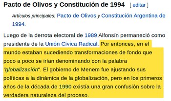 Cuando dice que “Alfonsín sostuvo entonces que era necesario dialogar y llegar a un acuerdo con el presidente “, da a entender que por cuestiones electorales Alfonsín hizo un acuerdo con Menem. La entrada omite el voto directo del Presidente (hasta entonces había colegio electoral) y el mecanismo de búsqueda de mayorías con el balotaje.