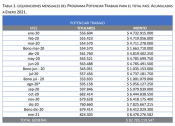 El programa se llama “Potenciar Trabajo”. La iniciativa del Ministerio de Desarrollo Social, a cargo de Daniel Arroyo, está destinado a brindar inclusión laboral, sobre todo a los trabajadores de la economía popular, y favorecer el acceso al crédito no bancario. Entre enero del año pasado y enero de 2021, el gobierno de Alberto Fernández le destinó $82.705.119.547. Para acceder a los beneficios que otorga el programa hay que inscribirse en el Registro Nacional de Trabajadores y Trabajadoras de la Economía Popular (RENATEP) que está bajo el liderazgo de Emilio Pérsico, el secretario de Economía Social y principal referente del Movimiento Evita.