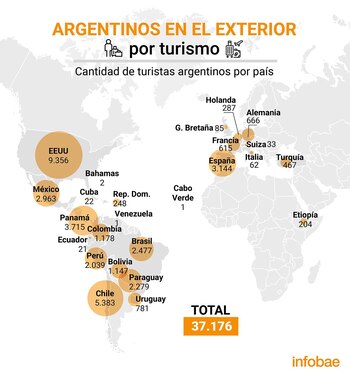 Esa tabla la encabeza Estados Unidos con 9.356. También figuran Panamá (en el tercer lugar con 3.715), España (cuarto destino, 3.144), Paraguay (2.279), Perú (2039), Colombia (1.178) y Bolivia (1.147). Luego se ubican otras siete naciones: Uruguay (781), Alemania (666), Francia (615), Turquía (467), Holanda (287), República Dominicana (248) y Etiopía (204).