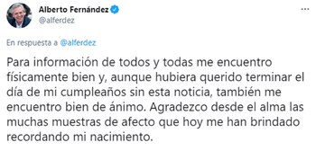“Para información de todos y todas me encuentro físicamente bien y, aunque hubiera querido terminar el día de mi cumpleaños sin esta noticia, también me encuentro bien de ánimo. Agradezco desde el alma las muchas muestras de afecto que hoy me han brindado recordando mi nacimiento”, comentó al respecto el propio mandatario, a través de su cuenta de Twitter.
