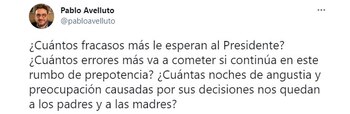 “No te tenemos miedo, Alberto Fernández. Se acabó la paciencia de los mansos. Te metiste con la educación de nuestros hijos. Ni olvido ni perdón”, había publicado Avelluto.