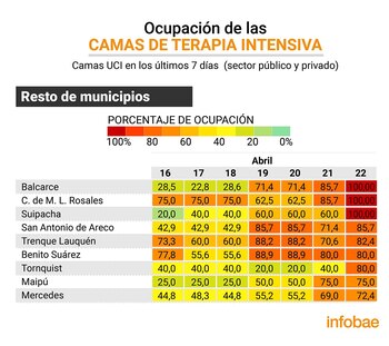 Los municipios de Trenque Lauquen, Benito Juárez, Tornquist y Maipú tienen sus terapias al borde del colapso. Las ocupaciones de sus camas de UTI oscilan entre el 80% y casi el 86%. Por esa razónm desde esas instituciones públicas o privadas, los pacientes con menores complicaciones generadas por el COVID-19 son derivados, por ejemplo, a Maipú o Mercedes, donde el nivel de internaciones es del 75,0% y del 72,4%, respectivamente.