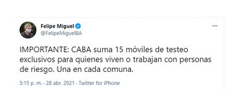 Así también lo anunció el jefe de Gabinete de la Ciudad, Felipe Miguel. “CABA suma 15 móviles de testeo exclusivos para quienes viven o trabajan con personas de riesgo. Una en cada comuna”, comunicó el funcionario en redes sociales.