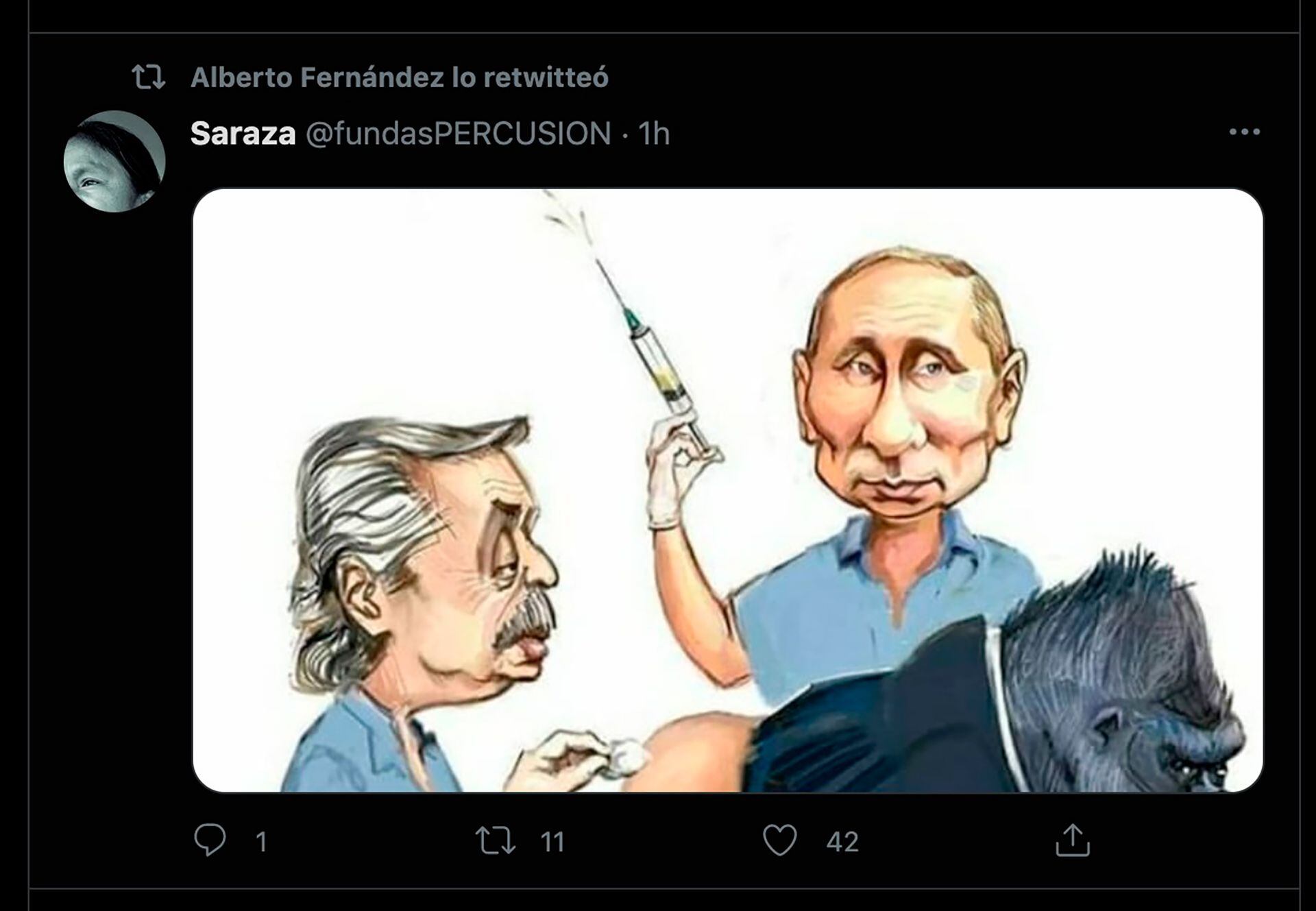 Hace menos de tres semanas, otro retuit del presidente también había generado revuelo. El 21 de abril compartió una imagen del caricaturista Serko (Sergio Kohan), que lo tenía a él junto a Vladimir Putin, presidente de Rusia, vacunando a un gorila.