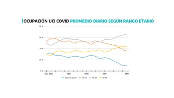 Entonces, aquella foto de los números de principio de año cambió. Actualmente, las personas que tienen más de 80 años ocupan menos del 10% de la capacidad de las UTI y las que tienen entre 70 y 79 años, están por debajo del 20% de la demanda de camas. Ambos rangos etarios presentaron una caída constante de su presencia en unidades de cuidados intensivos desde que se inició el proceso de vacunación.