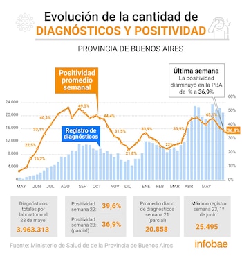 En la provincia de Buenos Aires los testeos siguen siendo insuficientes para tener una eficaz política de rastreo y aislamiento para evitar la diseminación del SarsCoV-2. En la última semana la positividad fue del 36,9%, según los últimos datos del Ministerio de Salud bonaerense a los que accedió Infobae. Pero llegó a ser mucho más alta, del 48,7% el 21 de mayo.
