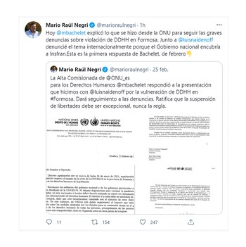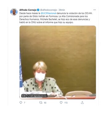 “La Alta Comisionada de la ONU volvió a referirse a las violaciones de DDHH que sucedieron en Formosa y al accionar del organismo luego de la denuncia que presentamos con @marioraulnegri. El mundo sigue mirando a nuestro país para que esto no quede impune”, afirmó por su parte el senador por Formosa Luis Naidenoff.