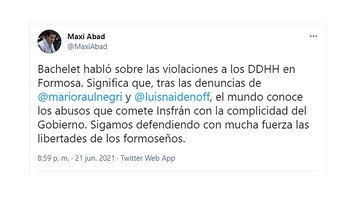 Maximiliano Abad, presidente de la UCR bonaerense, también se hizo eco de lo sucedido: “Bachelet habló sobre las violaciones a los DDHH en Formosa. Significa que, tras las denuncias de @marioraulnegri y @luisnaidenoff, el mundo conoce los abusos que comete Insfrán con la complicidad del Gobierno. Sigamos defendiendo con mucha fuerza las libertades de los formoseños”.