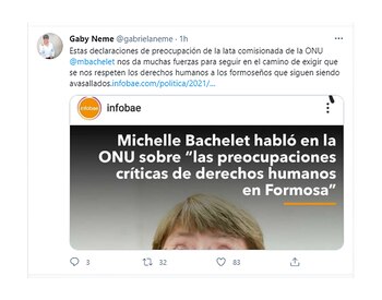 En tanto, la concejala formoseña Gabriela Neme, que fue detenida en enero tras haber denunciado a Gildo Insfrán por las condiciones inhumanas en los centros de aislamiento, consideró: “Estas declaraciones de preocupación de la lata comisionada de la ONU @mbachelet nos da muchas fuerzas para seguir en el camino de exigir que se nos respeten los derechos humanos a los formoseños que siguen siendo avasallados”.