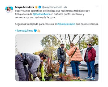 Mendoza contó en sus redes sociales la situación. “Quiero contarles a mis vecinos y vecinas de Quilmes que mañana jueves seré intervenida quirúrgicamente para extirpar un adenoma pleomorfo de la glándula parótida izquierda”, y señaló que “estaré unos días recuperándome para volver a trabajar con el amor, la voluntad y energía de siempre”.
