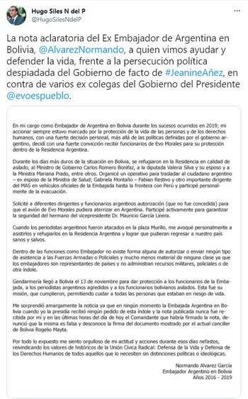 A raíz de esta denuncia, el ex embajador Álvarez García difundió un documento en el que aseguró: “En ningún momento la Embajada Argentina en Bolivia cuando yo la presidía recibió ningún pedido de esta índoles y la nota publicada nunca fue recibida por mí y en las últimas horas del día de hoy el Comandante que habría firmado la nota denunció que la misma es false y desconoce la firma”.
