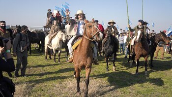 Aunque se había remarcado que el acto que realizan productores y trabajadores autoconvocados del campo en San Nicolás sería multisectorial y no impulsado por partidos políticos, la presidenta del PRO, Patricia Bullrich, apareció en escena con poncho y a caballo. “Vengo como una persona común, no como dirigente política”, aclaró la ex ministra de Seguridad durante el gobierno de Mauricio Macri.