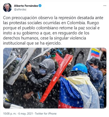 La cauta opinión de Alberto Fernández sobre los hechos de violencia registrados en Cuba -con protestas en las calles, represión y la denuncia de decenas de detenidos/desaparecidos- contrastó con las definiciones que por medio de su cuenta personal de Twitter pronunció en mayo pasado, cuando el gobierno de centroderecha de Iván Duque debió enfrentar manifestaciones callejeras de movimientos de izquierda. En ese momento, condenó de manera contundente la “represión desatada ante las protestas sociales”. Además, exigió al gobierno colombiano que, “en resguardo de los derechos humanos, cese la singular violencia institucional que ha ejercido”.