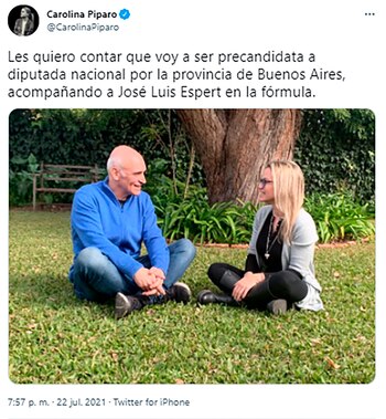 A pocos días de la fecha de cierre para confirmar las listas de cara a las PASO 2021, la diputada provincial Carolina Píparo confirmó a través de un extenso hilo de Twitter su ruptura con Juntos por el Cambio y su nueva alianza con el frente político Avanza Libertad, de José Luis Espert, a quién acompañará con un nuevo objetivo político: ser diputada nacional.