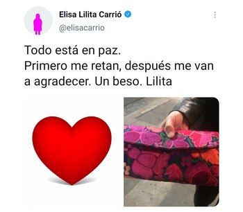 “Todo está en paz. Primero me retan y después me van a agradecer”, escribió la dirigente en medio de la campaña de la coalición opositora de cara a las PASO y de la discusión con el candidato radical Facundo Manes, a quien trató de mentiroso y amenazó con denunciarlo en la justicia. Al breve texto sumó la figura de un corazón y una pequeña cartera de mano.