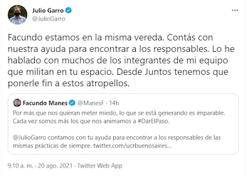 “Facundo estamos en la misma vereda. Contás con nuestra ayuda para encontrar a los responsables. Lo he hablado con muchos de los integrantes de mi equipo que militan en tu espacio. Desde Juntos tenemos que ponerle fin a estos atropellos”, fue la respuesta de Garro.