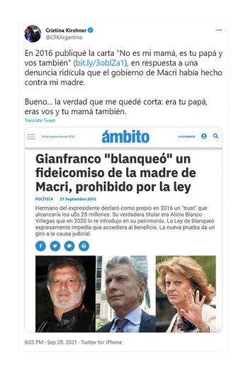 El resto de la carta de 2016 estaba enfocada a los negocios de la familia Macri con el Estado, en especial, con “la dictadura genocida había desaparecido a miles de argentinos”. Es por eso que este martes recordó “la verdad que me quedé corta: era tu papá, eras vos y tu mamá también”, junto a un artículo periodístico de Ámbito Financiero, en el que aseguran que Gianfranco Macri -hermano del ex mandatario- blanqueó un fideicomiso de su madre prohibido por la ley.