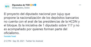 “El proyecto del diputado nacional por Jujuy que propone la nacionalización de los depósitos bancarios no cuenta con el aval de las presidencias de la HCDN y el bloque. Es la iniciativa de 1 diputado sobre 117 y no es acompañado por quienes forman parte del oficialismo”, publicó la cuenta oficial del Frente de Todos en sus redes sociales para desmentir categóricamente que el la iniciativa de José Luis Martiarena sea una idea del gobierno nacional.