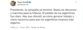 El diputado nacional electo Diego Santilli también cuestionó la movilización oficialista: “Presidente, la campaña ya terminó. Basta de discursos y marchas para la tribuna. El pedido de los argentinos fue claro. Hay que discutir ya cómo generar trabajo y cómo hacemos para que los argentinos vivamos más seguros”.