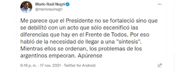 “Me parece que el Presidente no se fortaleció sino que se debilitó con un acto que sólo escenificó las diferencias que hay en el Frente de Todos. Por eso habló de la necesidad de llegar a una “síntesis”. Mientras ellos se ordenan, los problemas de los argentinos empeoran. Apúrense”, agregó el diputado Mario Negri, presidente del interbloque de Juntos por el Cambio.